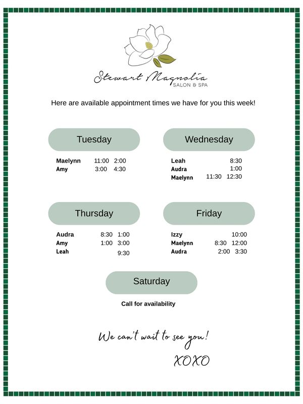 Our appointment openings are updated regularly, but availability can fill up or change quickly. We encourage you to book online for the most up-to-date options, or call/text the salon if you need assistance or have questions about scheduling. We’re always happy to help you find the perfect time for your visit!